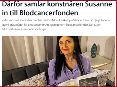 för att på olika sätt samla in pengar till forskningen om olika blodsjukdomar. En av dem är den internationellt erkända konstnären Susanne Strandänger, som fick höra talas om Albin Håkansons situation under förra året och ville göra en insats. Under mellandagarna 2021-2022 arrangerade hon en utställning i Stockholm, där hälften av alla intäkterna gick till forskning om diagnosen ALL. Hon gjorde detta just med tanke på Albin Håkanson, som är en vän till en av hennes familjemedlemmar. Läs mer om Susannes engagemang och skapande: https://blodcancerforbundet.se/aktuellt/nyheter/darfor-samlar-konstnaren-susanne-in-till-blodcancerfonden/