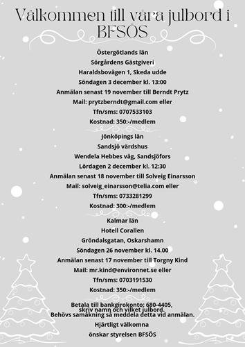 Nu är det dags att anmäla sig till något av våra trevliga julbord. Som vanligt är de utspridda geografiskt så att så många som möjligt ska kunna vara med. Vi ser fram emot att träffas, njuta av maten och varandras sällskap. Se bilden för anmälan.