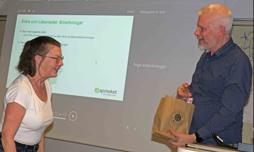 Därefter avslutades årsmötet och vi fick en intressant föreläsning av Michael Malmberg från Apoteket AB. Michael gick igenom hur olika typer av mediciner kan påverka oss samt hur vår känslighet och mottaglighet kan ändras när vi blir äldre. Han berättade också om den automatiska kontroll som nu finns i apoteksvärlden för att hitta förskrivningar där olika mediciner ”krockar” med varandra.